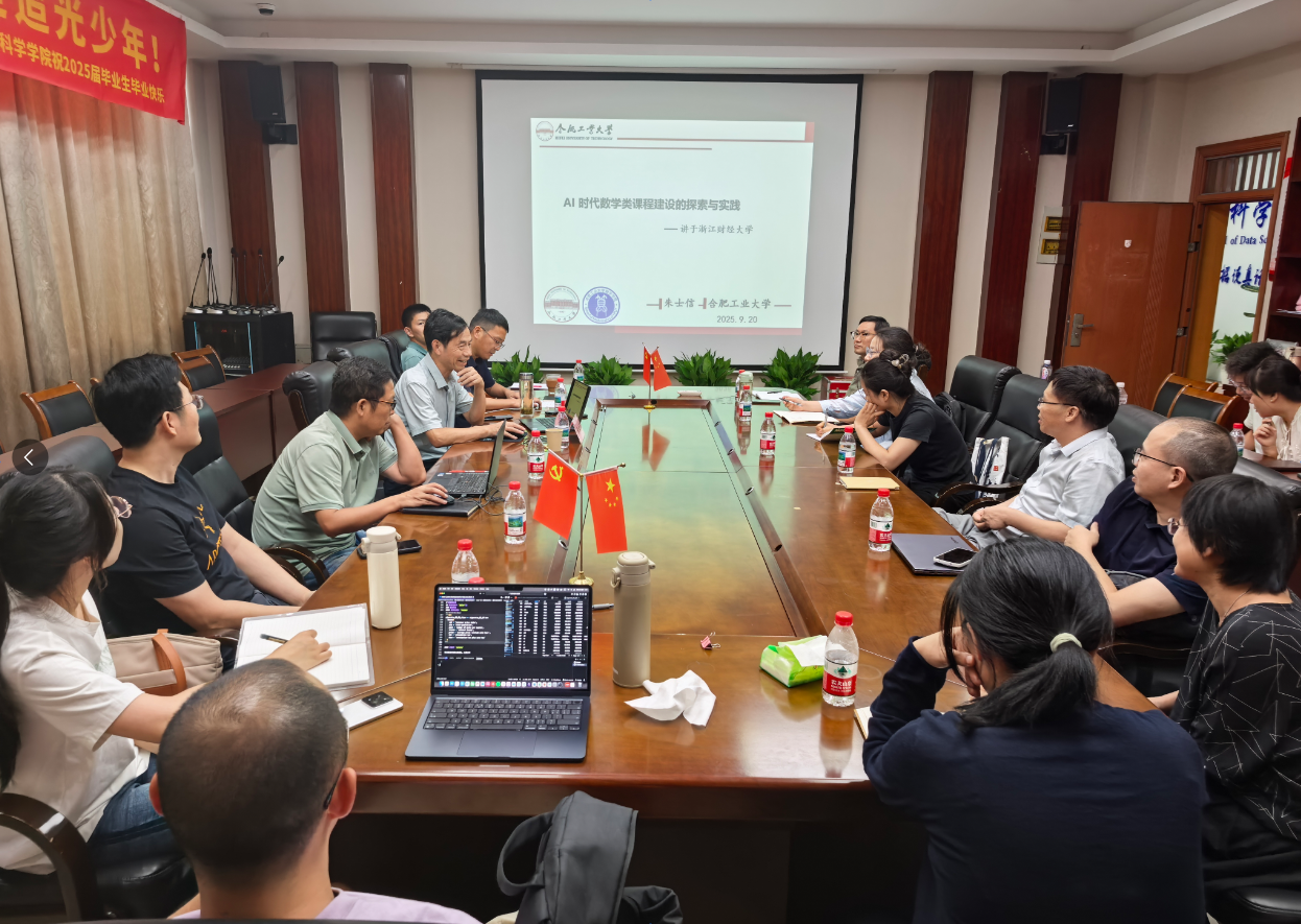 荣幸地邀请到了合肥工业大学数学学院朱士信教授,为老师们带来了一场以“AI 时代数学类课程建设探索与实践”为主题的精彩报告。学院领导、专业负责人、课程负责人和新进教师近20名教师到场聆听,郑松副院长主持。