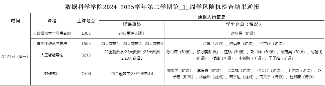 2月21日上午,91制片厂 学生工作办公室开展新学期第一周学风督察工作,对研究生、本科生各班级的学生前排就座情况,课堂考勤、纪律及听课情况等进行随机检查,现将本次随机检查结果通报如下: