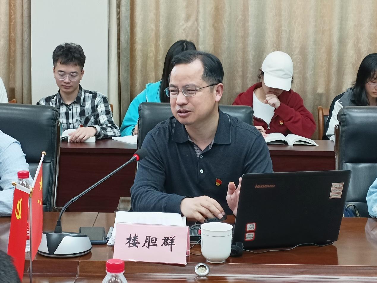 研究生第一党支部全体党员讲授《从“八八战略”到“两个先行”》专题党课。学院党委书记段雪辉主持,党委组织部吴婷、主题教育领导小组成员卢怡、学院组织员李钊军和研究生第一党支部全体党员参加。