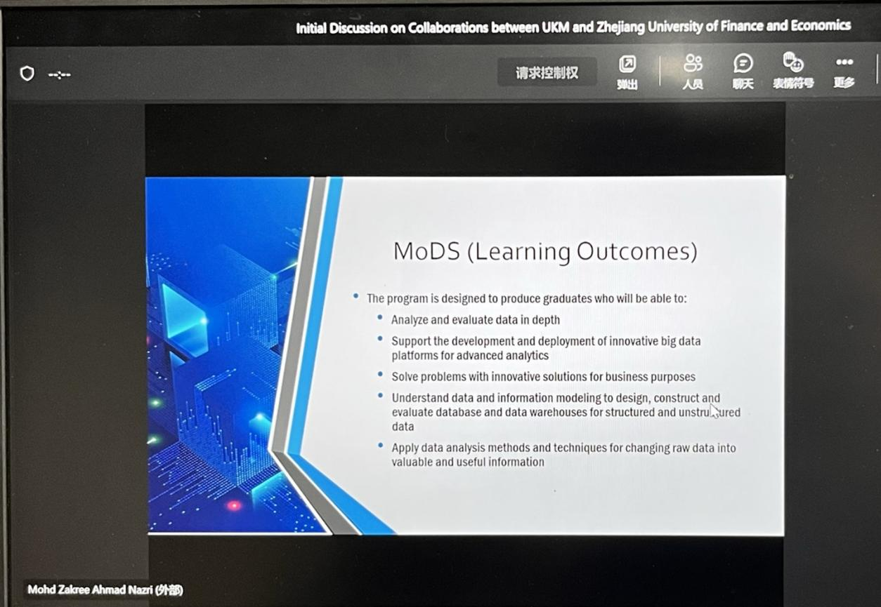 洪兴建首先介绍了学院的专业设置、师资团队及国际合作情况,并提出与马来西亚国立大学开展广泛的国际合作愿景。乐斌进一步介绍了我校目前开展的国际合作项目基本情况。扎克里·纳兹里详细介绍了学院目前开设的数据科学硕士课程,包括培养目标、录取标准,课程模块等内容。