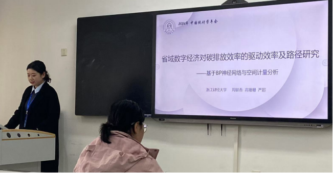 院长洪兴建教授主持了“数字经济统计与核算研究”主题分会场报告。徐丽笑、石薇分别作了题为《长三角区域人口结构变化对碳排放的影响测度研究》《生态产品总值(GEP)核算:核算理论与案例应用》的学术报告。