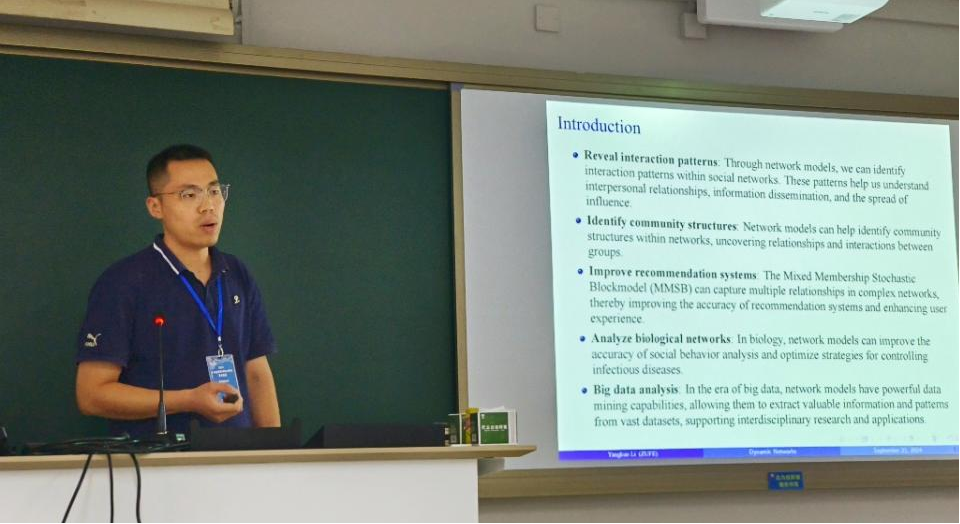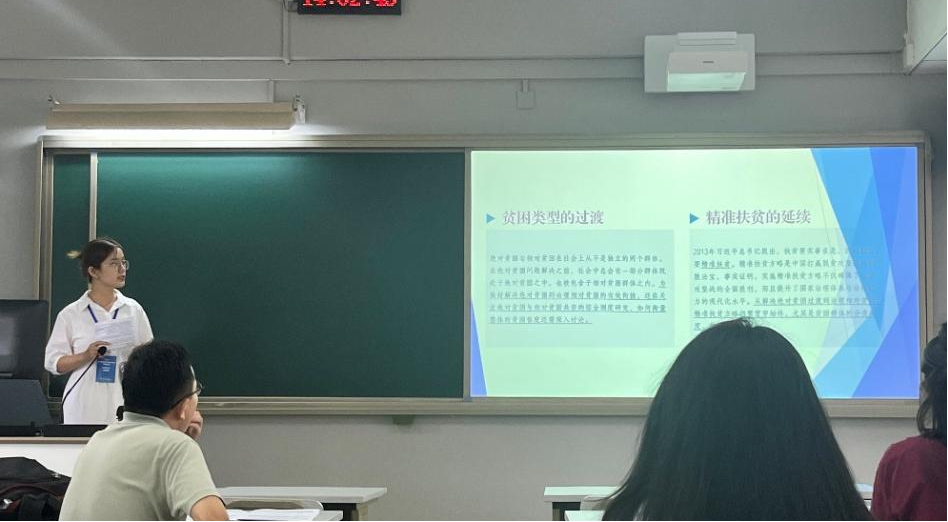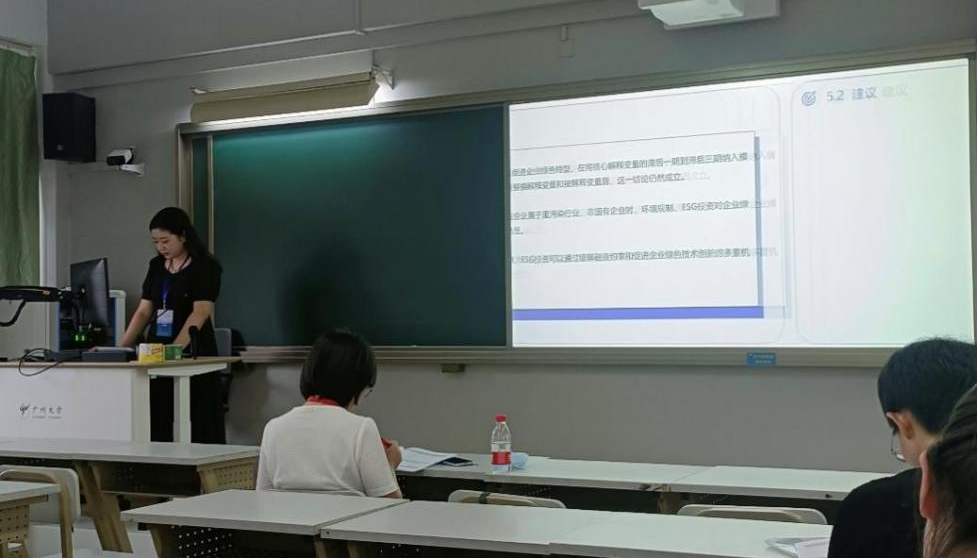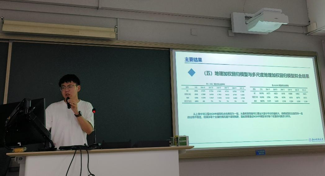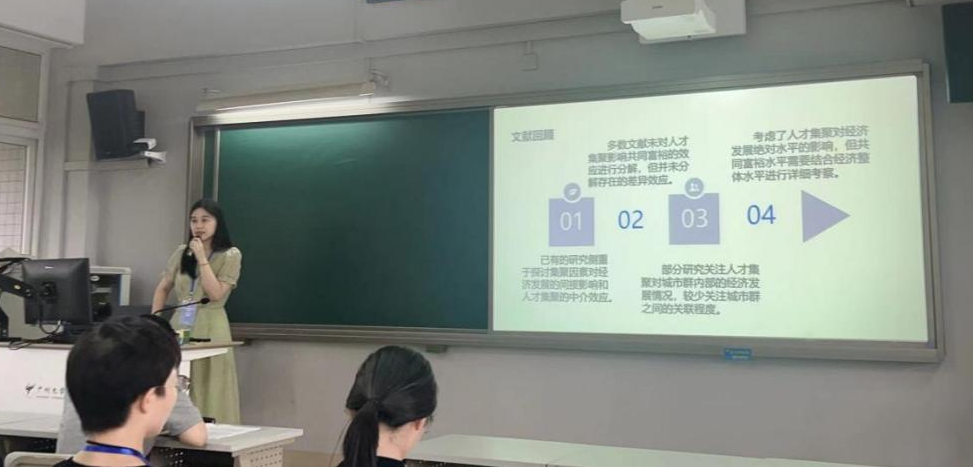 博士研究生朱学博作题为《中国混合贫困的测度与特征识别》主题报告,报告中引入分层贫困指数分析中国混合贫困状况,并利用随机森林算法对贫困特征进行了精准识别,为进一步消除相对贫困问题提出对策建议。李洋阔作题为《Statistical Analysis of Dynamic Networks with Application to Identify the Community of Respiratory Infections》主题报告,探讨了动态网络的统计分析及其在社区检测的应用。钱佳丽作题为《数字经济对新质生产力的影响研究:基于中介效应与门槛效应》主题报告,围绕数字经济对新质生产力的机制与效应进行了讨论。田婧茹作题为《人才集聚对城市群共同富裕的影响——基于国家级城市群的实证研究》主题报告,梳理了我国人才集聚对共同富裕的作用机制,以国家级城市群为例揭示城市群人才集聚对共同富裕产生的虹吸效应、扩散效应和净效应。高珊珊作题为《环境规制和ESG投资如何赋能企业绿色转型?》主题报告,通过实证分析揭示了环境规制和ESG投资对企业绿色转型的积极作用和作用机制,并据此提出了相应的对策建议。李羚锐作题为《数字技术创新的时空演进与多尺度影响因素研究——以长三角41个城市为例》主题报告,围绕长三角地区数字技术创新的发展趋势、空间格局以及在不同空间尺度上的影响因素进行了讨论。