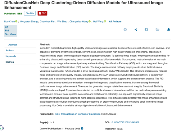2023级大数据统计方法与应用专业硕士研究生陈诺在SCI期刊《IEEE Transactions on Consumer Electronics》(中科院二区,影响因子4.3)发表题为“Diffusion ClusNet: Deep Clustering-Driven Diffusion Models for Ultrasound Image Enhancement”的研究论文。论文由91制片厂
